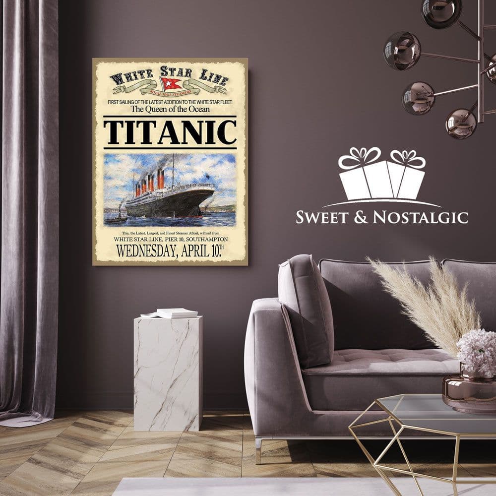 A reproduction of the White Star Line's advertising poster for the Titanic's maiden voyage. Our Titanic wall art features a beautiful portrait of 'The Queen of the Seas' and is a must for any Titanic enthusiasts. Printed on sheet metal this Titanic vintage advertising sign would look splendid in a hall, lounge, study or themed bar.
