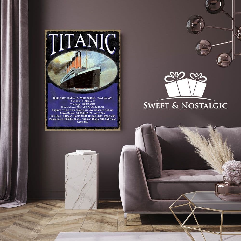 This vintage styled advertising sign could adorn any admirer's collection and gives all vital statistics about Titanic's capabilities. Our Titanic wall sign sports distressed edges for an authentic vibe. Titanic wall art makes an ideal decorator's piece for the study, hallway, lounge, bar or office.